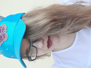 Прядку с лица убирает, заправляя со смехом в прическу;